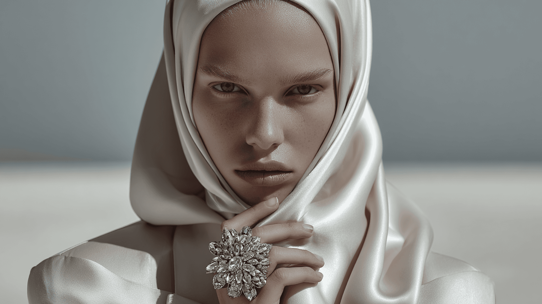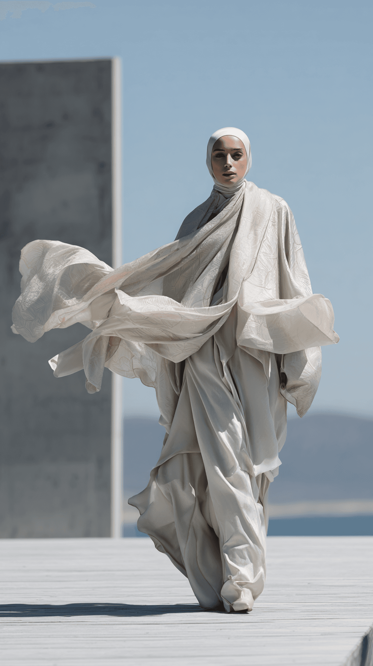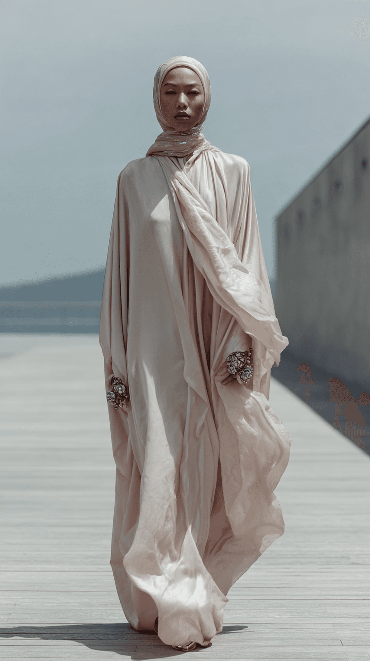 The Mareflor Rose Abaya features hand-embroidered roses on luxurious moiré fabric. Designed in a wrap cut for timeless elegance.