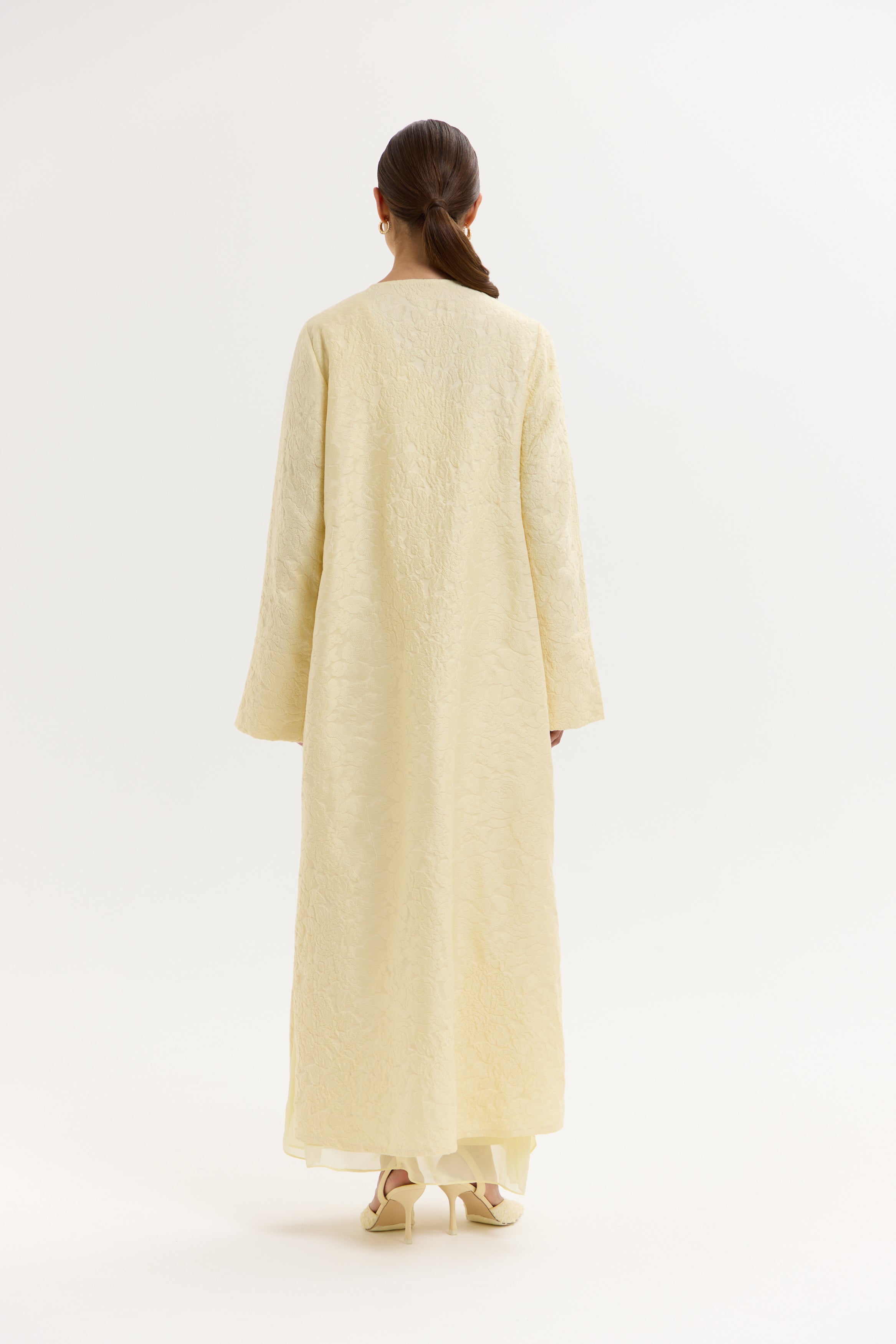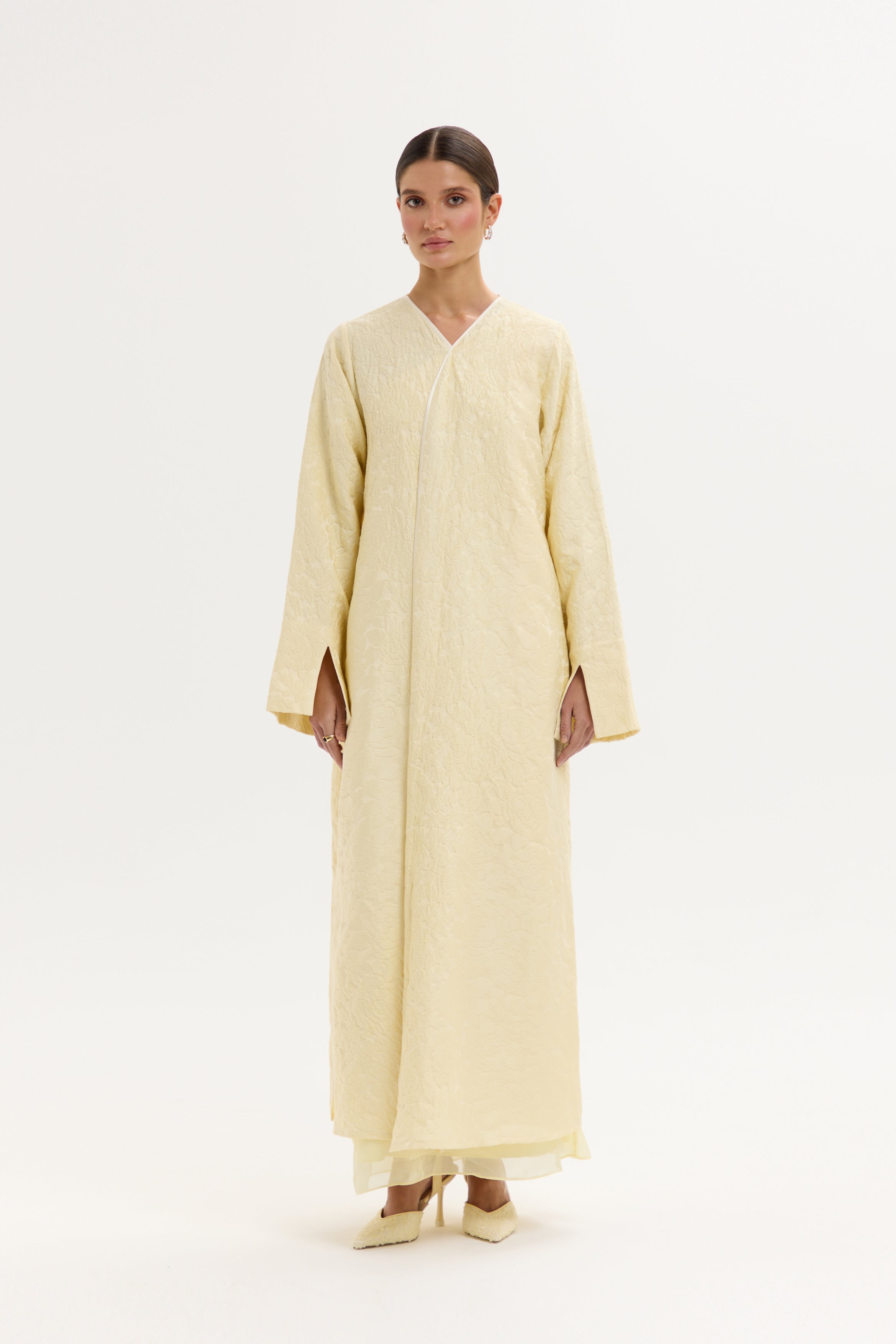 An abaya cut from natural silk jacquard, woven with a subtle texture and soft golden tone. Light catches gently on the surface, creating dimension without excess. Designed to drape effortlessly while maintaining structure.